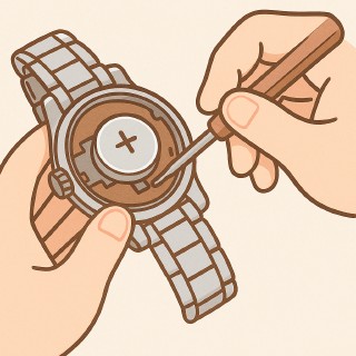 まず、裏蓋を開ける専用工具を使って本体を開け、古い電池を慎重に取り外します。同じ型番の電池を用意して静電気に注意しながら装着させます。無理な力を加えると故障の原因になるため、慎重に行うのがポイントです。